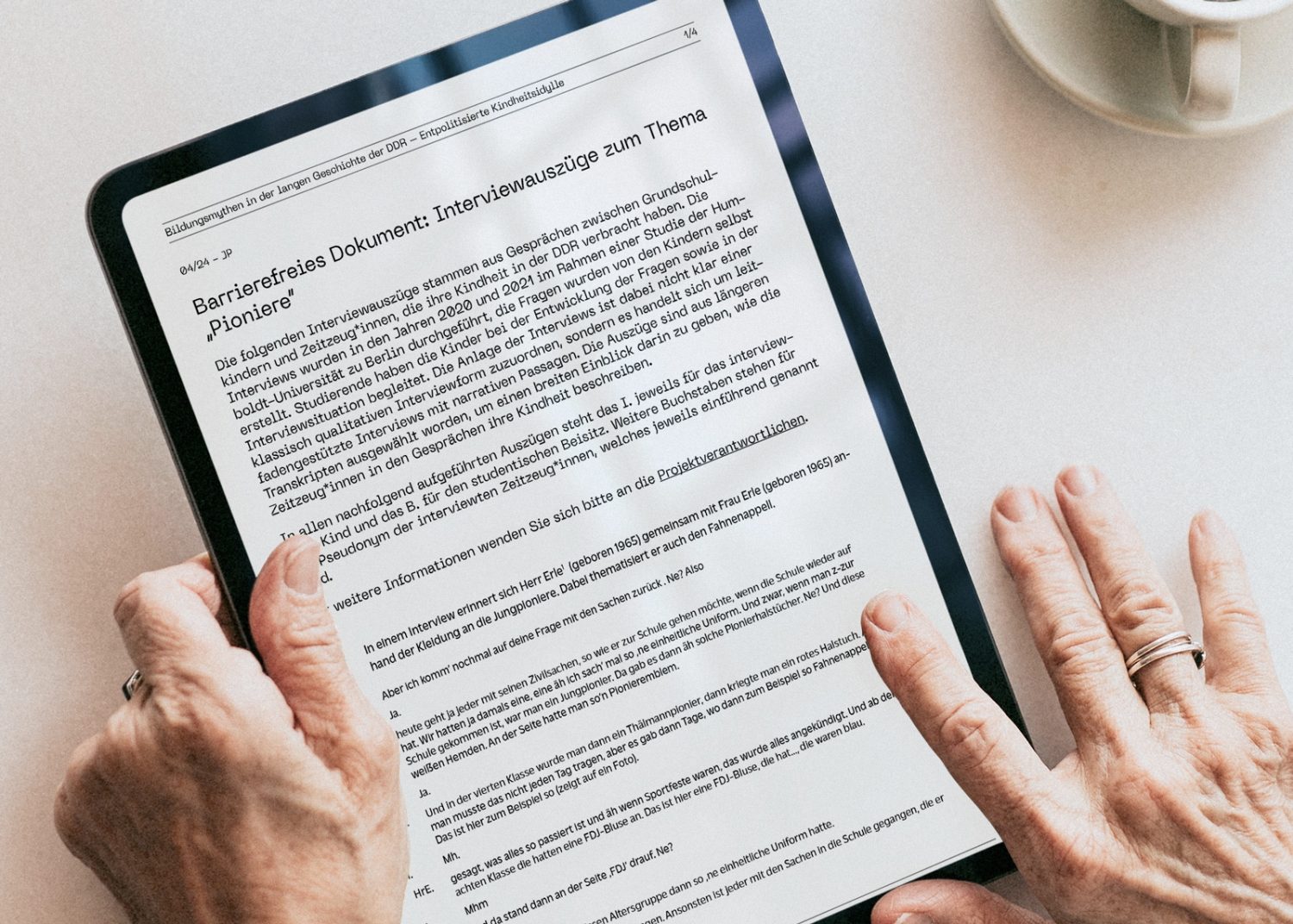 The interviews were conducted in 2020 and 2021 as part of a study by the Humboldt University of Berlin, and the questions were created by the children themselves. Students accompanied the children in developing the questions and in the interview situation. The structure of the interviews cannot be clearly assigned to a classic qualitative interview form, but rather they are guideline-based interviews with narrative passages. The excerpts have been selected from longer transcripts, in order to provide a broad insight into how the contemporary witnesses describe their childhood in conversations.